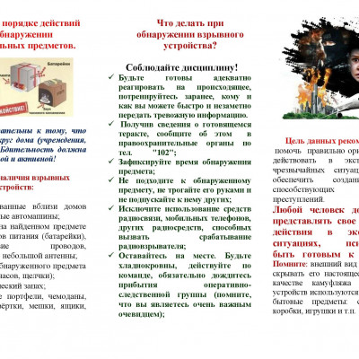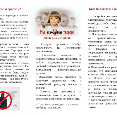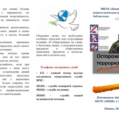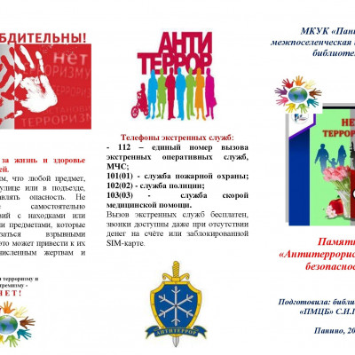 Терроризм представляет одну из самых серьёзных угроз миру и безопасности. В наше время необходимо вести разъяснительную работу, создавая условия для нормальной жизни в обществе. Сотрудники методико-библиографического отдела Панинской межпоселенческой центральной библиотеки подготовили печатные издания малых форм: буклеты и памятки, которые рекомендуют использовать при проведении антитеррористических акций и других мероприятий с целью разъяснения и информирования о возможной угрозе среди населения района.