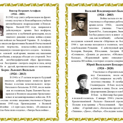 2024 год объявлен Годом лейтенантской прозы. Это связано со 100-летием четырех писателей-фронтовиков, вернувшихся с войны лейтенантами, - Юрия Бондарева (15.03), Бориса Васильева (21.05), Василя Быкова (19.06) и Владимир Богомолов (3.07), родившихся в 1924 году и ушедших на фронт совсем еще юношами.