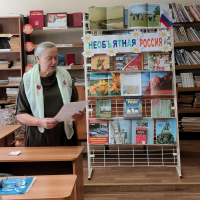 К этому знаменательному дню была оформлена тематическая выставка: «Необъятная Россия», на которой была представлена литература, рассказывающая об истории праздника, о русской государственности, о знаменитых именах России, удивительно красивых и необъятных просторах нашей Родины.