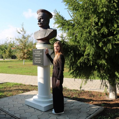 Ученица Дарья Каширская, праправнучка полного Георгиевского кавалера Александра Варварина с гордостью рассказывала о своем знаменитом родственнике, бюст которому был установлен 9 мая 2020 года.