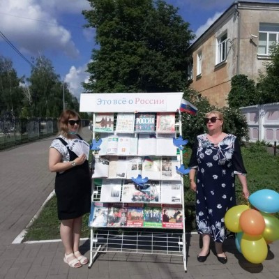 А на площадке перед библиотекой была организована уличная выставка-просмотр «Это все о России», на которой была представлена литература об истории и современном развитии, государственных символах России. Любой желающий мог с ней ознакомиться.