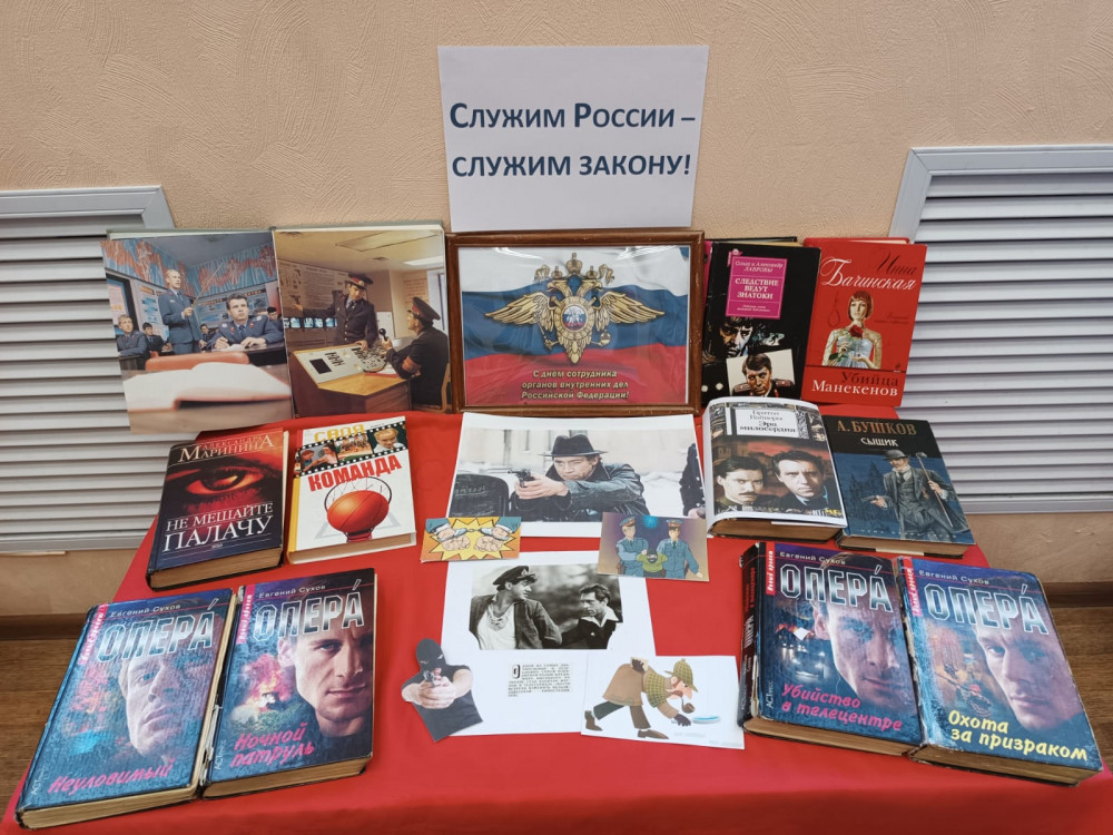 К этому празднику в отделе обслуживания Панинской МЦБ оформлена книжно-иллюстративная выставка «Служим России – служим закону!». На ней представлены книги об истории становления советской милиции, а также художественные книги, на страницах которых - замысловатые сюжеты с неожиданными развязками, где сотрудники МВД ведут расследования, устанавливают истины, распутывают загадочные клубки преступлений.