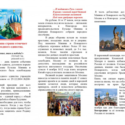 4 ноября – памятная дата Отечественной истории. В этот день по всей России с 2005 года отмечается День народного единства. Этот праздник установлен в честь важного события в истории России — освобождения Москвы от польских интервентов в 1612 году, и приурочен ко Дню Казанской иконы Божией Матери. В этот день 411 лет назад, 4 ноября (24 октября по старому стилю), русское ополчение под предводительством нижегородского земского старосты Кузьмы Минина и князя Дмитрия Пожарского после штурма Китай-города вынудило польских интервентов, запершихся в Московском кремле, сдаться.