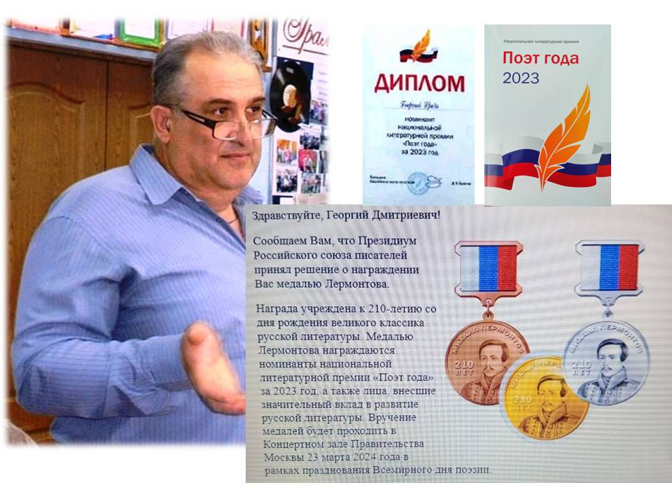 В культурной жизни района – знаковое событие. Георгий Дмитриевич Гроза, номинант премии «Поэт года» за 2023 год, Большим конкурсным жюри Российского союза писателей представлен к награждению медалью «Михаил Лермонтов - 210 лет». Награда была учреждена к 210-летию со дня рождения великого классика русской литературы, в память о великом поэте. Медалью Лермонтова награждаются номинанты национальной литературной премии «Поэт года» за 2023 год, а также лица, внёсшие значительный вклад в развитие русской литературы. Вручение медалей будет проходить в Концертном зале Правительства Москвы 23 марта 2024 г. в рамках празднования Всемирного дня поэзии.
