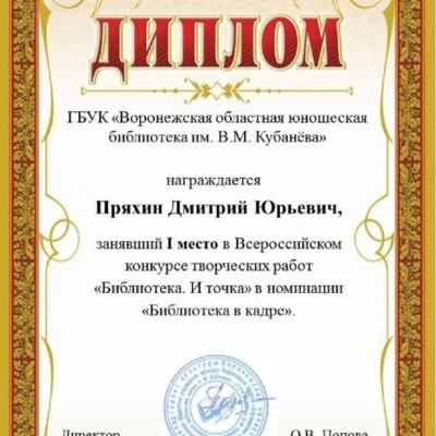 В номинации «Библиотека в кадре» 1 место занял Пряхин Дмитрий Юрьевич.