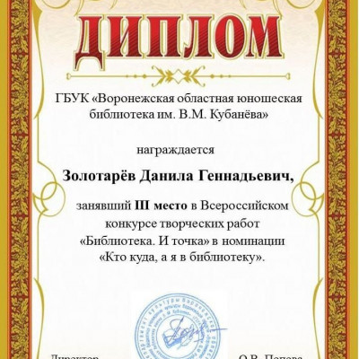 В номинации «Кто куда, а я в библиотеку» 3 место занял Золотарёв Данила Геннадьевич.